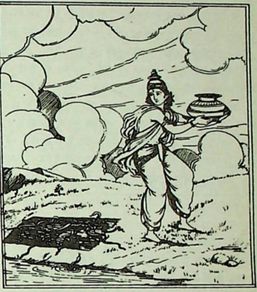गरुड़ जी के द्वारा लाया गया अमृत कलश कुश के ऊपर पर रखा था वहां से इंद्र इसे उठाकर वापस ले जाते हुए।