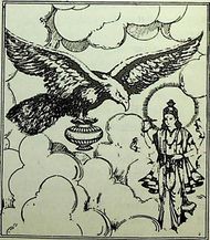 देवताओं से अमृत कलश ले जाते हुए गरुड़ जी।
