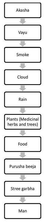 अभ्रं भूत्वा मेघो भवति मेघो भूत्वा प्रवर्षति त इह व्रीहियवा ओषधिवनस्पतयस्तिलमाषा इति जायन्तेऽतो वै खलु दुर्निष्प्रपतरं यो यो ह्यन्नमत्ति यो रेतः सिञ्चति तद्भूय एव भवति ॥ ६ ॥ (Chan. Upan. 5.10.6)